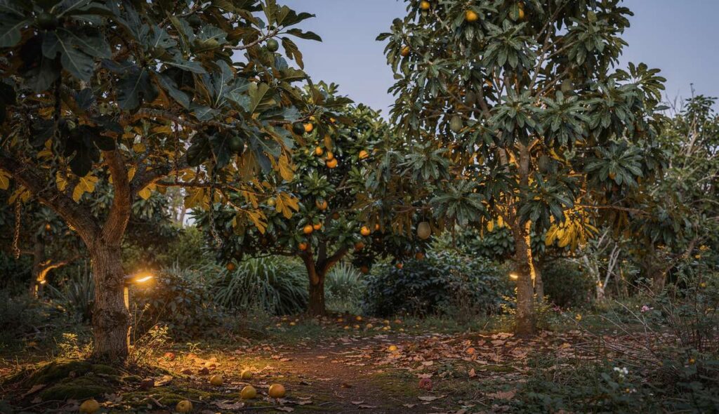 Preferire alberi con portamento colonnare o piramidale riduce le zone d’ombra al suolo. Le varietà con frutti che rimangono attaccati più a lungo all’albero diminuiscono l’accumulo di materiale in decomposizione. Gli agrumi, in particolare limoni e arance, creano un ambiente meno favorevole grazie al fogliame sempreverde rado che non trattiene eccessiva umidità.