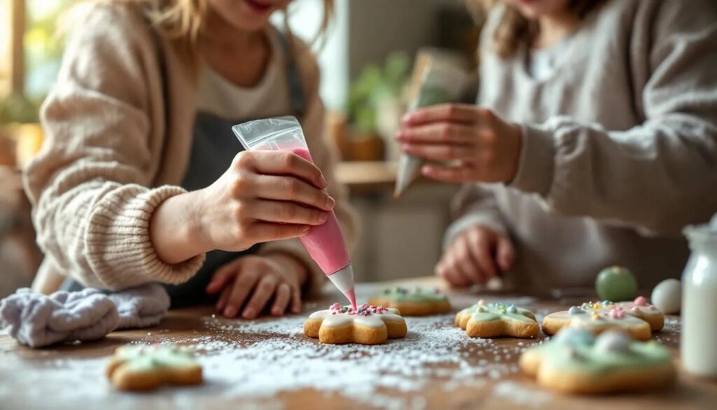 Per i bambini sotto i 4 anni, scegliete formine con contorni semplici e privi di dettagli sottili: l’uovo ovale, il cerchio, il fiore con petali larghi. Le forme molto elaborate — come il coniglio con orecchie lunghe e sottili — tendono a rompersi durante il ritaglio e la decorazione, generando frustrazione. Mettete a disposizione pennelli da pasticceria morbidi per spalmare la glassa invece del sac à poche: è più facile da gestire per le mani piccole e altrettanto divertente.