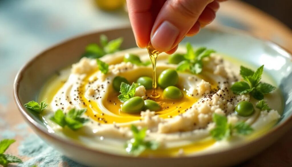 Aggiungere all’olio aromatizzato le fave scolate, il pecorino grattugiato e qualche foglia di menta fresca. Frullare a potenza media, aggiungendo acqua fredda a filo — un cucchiaio per volta — fino a raggiungere la consistenza desiderata. Per un antipasto da spalmare su crostini o bruschette, la crema deve risultare morbida ma compatta, simile a un hummus denso. Per un uso come base di piatti o accompagnamento a formaggi, aggiungere qualche cucchiaio d’acqua in più per renderla più fluida. Assaggiare e regolare di sale: il pecorino è già sapido, quindi procedere con cautela. Una macinata generosa di pepe nero chiude l’equilibrio aromatico.