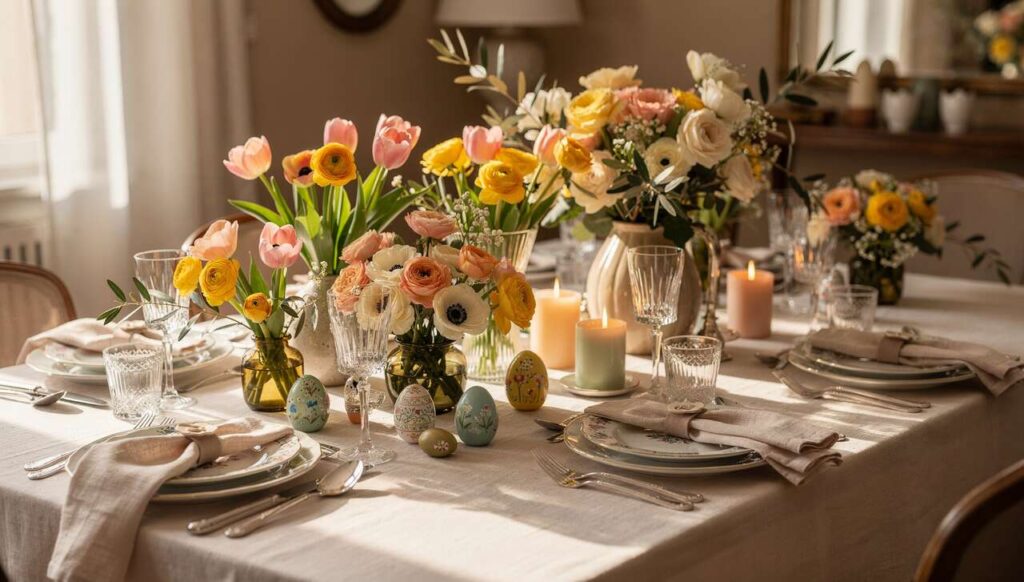 Oltre ai fiori, altri elementi decorativi contribuiscono a completare l’atmosfera pasquale con tocchi tematici e simbolici.
