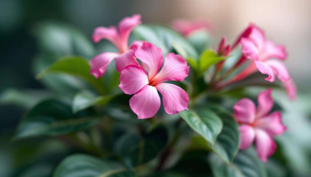 Il fogliame della dipladenia presenta foglie ovali, lucide e di un verde intenso che persistono tutto l’anno in condizioni favorevoli. I fiori, dalla forma a trombetta, sbocciano in abbondanza e offrono una palette di colori che spazia dal bianco puro al rosso carminio, passando per diverse tonalità di rosa.