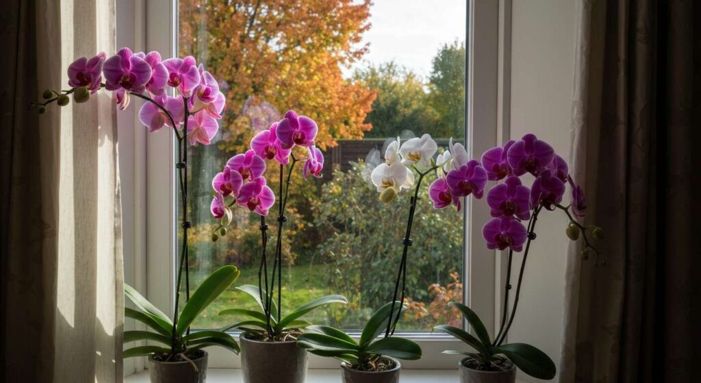 La RHS raccomanda di posizionare le orchidee vicino a finestre orientate a sud o sud-est durante i mesi invernali. Queste esposizioni garantiscono il massimo apporto di luce naturale senza esporre le piante ai raggi diretti più intensi del pomeriggio. Le finestre orientate a est offrono una luce delicata al mattino, ideale per le varietà più sensibili come le Phalaenopsis.