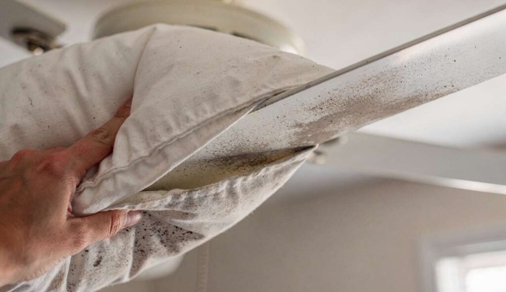 Anche se la federa cattura la maggior parte della polvere, è prudente posizionare un telo o un vecchio lenzuolo sotto il ventilatore. Questa protezione supplementare raccoglie eventuali particelle che potrebbero sfuggire durante la manipolazione. Si può anche utilizzare carta di giornale per facilitare lo smaltimento.