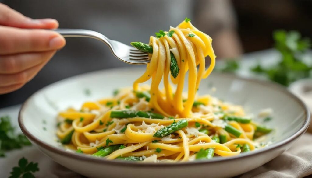 In primavera, quando gli asparagi sono al loro apice, non occorre mascherarli. Se volete un tocco in più, grattugiate un po’ di scorza di limone non trattato direttamente nel piatto prima di servire: l’acidità agrumata amplifica la freschezza vegetale degli asparagi senza coprirla. Un altro segreto sta nella scelta del formato: i rigatoni o le mezze maniche raccolgono il condimento all’interno, mentre le linguine lo avvolgono. Entrambe le soluzioni funzionano, ma per un primo primaverile leggero, le linguine o gli spaghetti alla chitarra danno un risultato più elegante e meno pesante. Evitate i formati corti lisci, che scivolano via dal condimento senza trattenerlo.