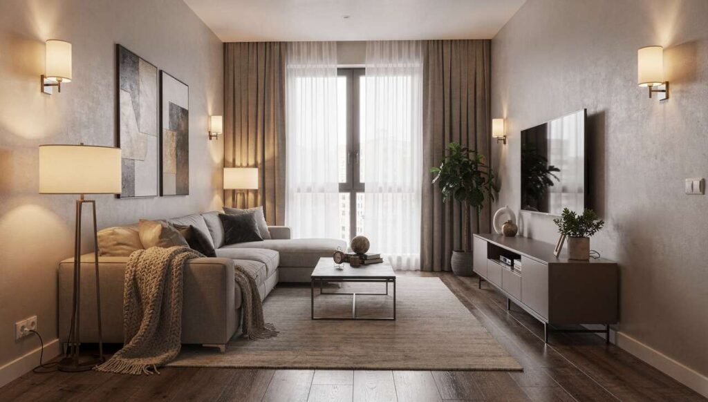 L’illuminazione murale ben progettata produce un effetto di ampliamento dello spazio. Illuminare le pareti laterali in un soggiorno stretto riduce la sensazione di corridoio e crea un ambiente più equilibrato e proporzionato.