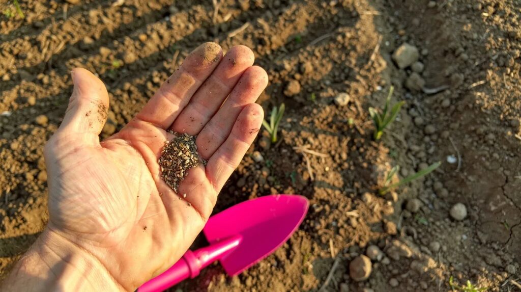 I semi sono molto piccoli — simili come dimensione a quelli del basilico. Si mescolano con un po’ di sabbia asciutta in un rapporto di 1 a 4 per facilitare la distribuzione uniforme. Si spargono poi a mano sul terreno preparato, cercando di coprire la superficie in modo regolare. La densità consigliata è di circa 1–2 grammi di seme per metro quadrato: meno di quanto si pensi. Dopo la distribuzione, si passa il rastrello molto delicatamente per interrare i semi a non più di 0,5–1 cm di profondità. Un interramento troppo profondo ne compromette la germinazione.