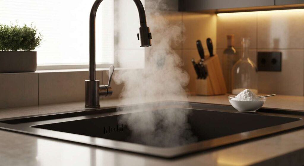 Dopo il tempo di attesa, portate a ebollizione 1-2 litri d’acqua. Versatela con decisione nello scarico in un unico getto continuo. L’acqua bollente completa il processo sciogliendo definitivamente i residui ammorbiditi e spingendo via tutto il materiale disgregato. Se necessario, ripetete l’operazione una seconda volta per risultati ottimali.