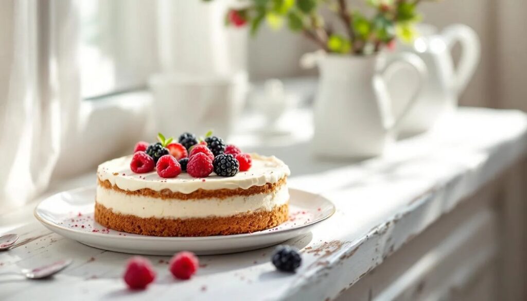 Per sformare la torta senza rischi, passate un coltellino sottile e liscio tra il bordo della crema e la parete dello stampo, con un movimento continuo e delicato. Aprite la cerniera lentamente. Trasferite la torta — ancora sulla base di carta forno e sul disco dello stampo — su un piatto da portata. Distribuite i frutti di bosco conditi sulla superficie, lasciando che il loro sciroppo coli naturalmente verso i bordi. Aggiungete i frutti interi tenuti da parte come decorazione. Servite subito oppure conservate in frigorifero fino al momento del trasporto.